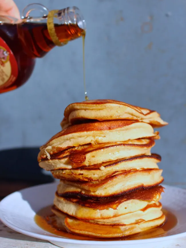 Det här receptet är en variant som ger extra fluffiga pannkakor, gjorda med rårismjöl och en större mängd banan. Serverade med lönnsirap blir de rejält söta, så välj gärna den här versionen till helgfrukost eller som dessert efter soppa. Mycket barnvänliga.
