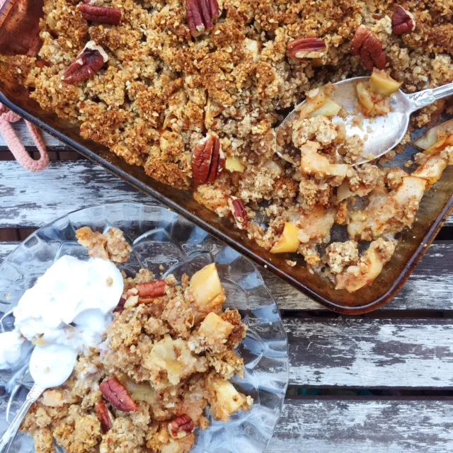 En saftig supergod glutenfri smulpaj med pecannötter eller andra nötter (valnötter och hasselnötter blir också superbra), kryddade äpplen och naturlig sötma från lönnsirap och russin...