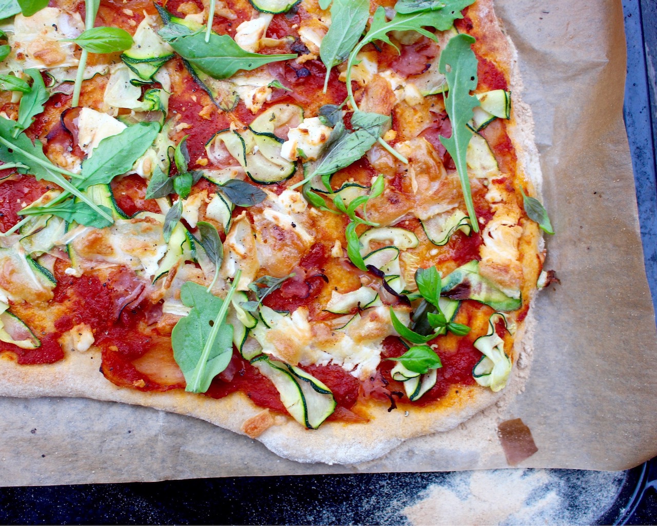 Pizza som inte ger matkoma. Jag gjorde egen tomatsås och toppade med generöst med zucchini och getost.