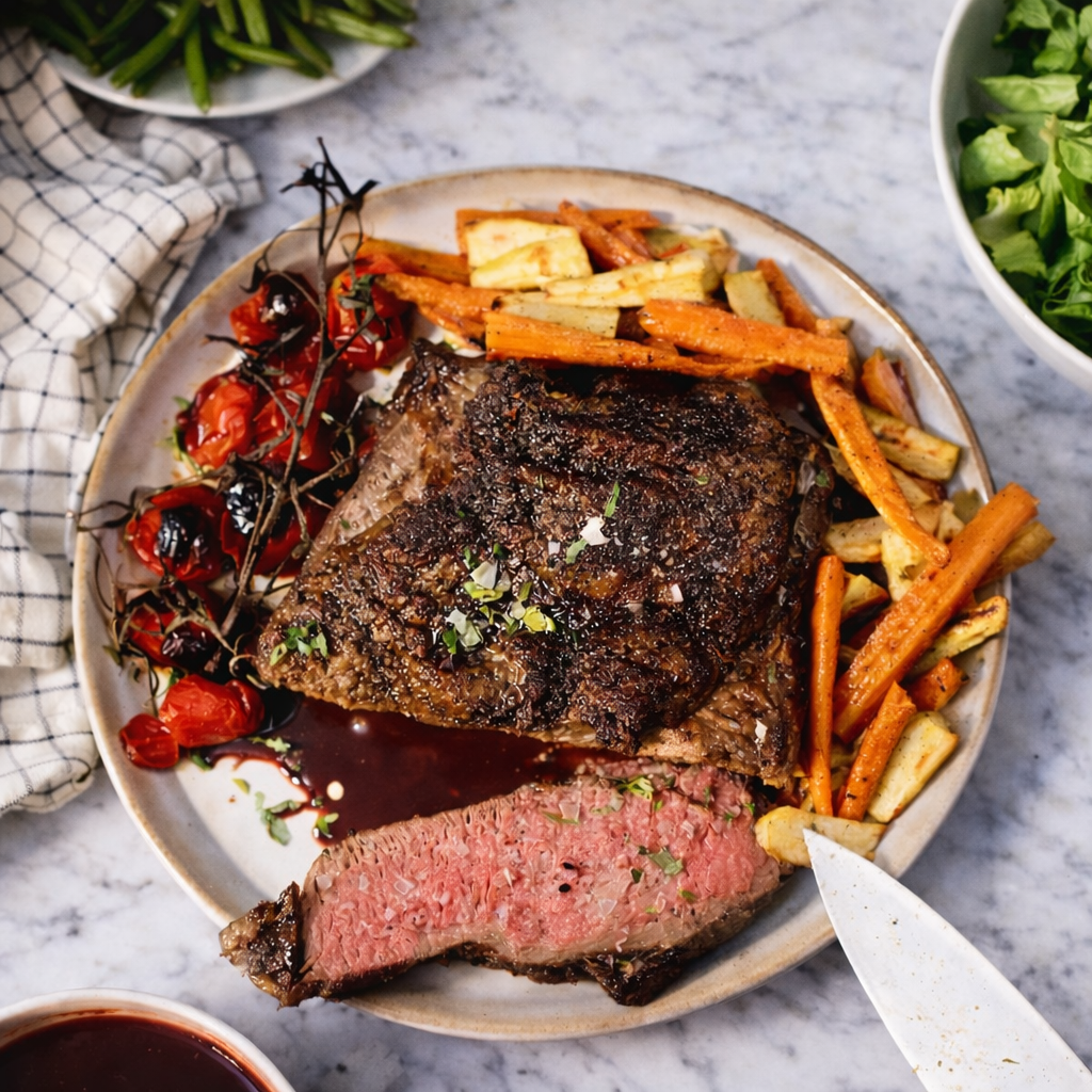 Festrätter utan mjölkprodukter och gluten har länge varit efterfrågade av er... Helstekt ryggbiff med klassiska tillbehör: vitlöksstekta haricot vertes, rostade tomat och rostade grönsaker kommer här!