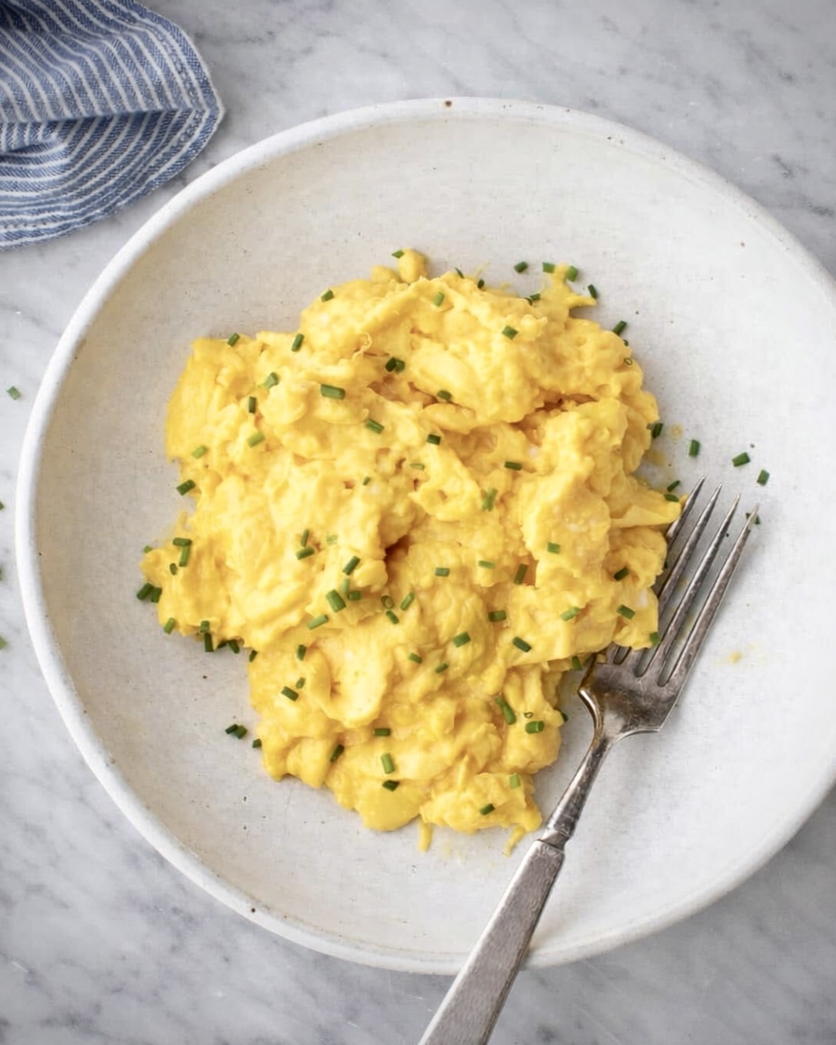 Perfekta blir äggen genom att använda helst smör men ghee eller olivolja går bra till stekningen och genom tillåta långsam tillagning under omrörning. (Om du använder ghee eller olivolja – var extra försiktig med temperaturen eftersom att rent fett snabbare går upp i temperatur). Ta pannan från värmen när äggen fortfarande är krämiga. Bäst smakar scrambed eggs tycker jag med salt peppar och bara lite gräslök.