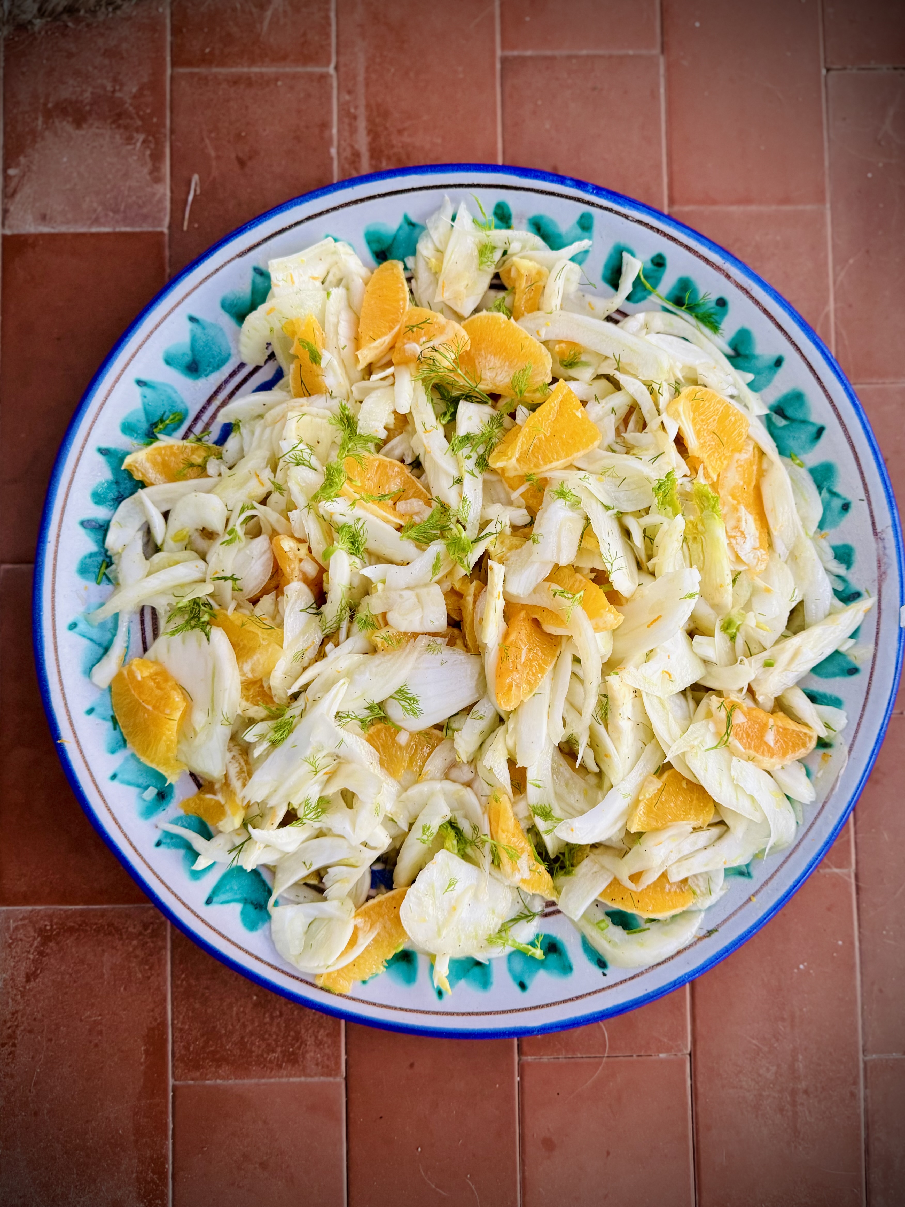Fänkål äts gärna rå här på Sicilien, tunt skivad. Den är oftast mer stroväxt än den imorterade vi får till oss i Sverige och är krispig och lätt söt, med en tydlig anisnot som inte tar över. Apelsinen bidrar med syra och saft, men också med den där svaga bitterheten som finns i hinnorna – särskilt tydlig i blodapelsin under vintern. Rekommenderas att testa!