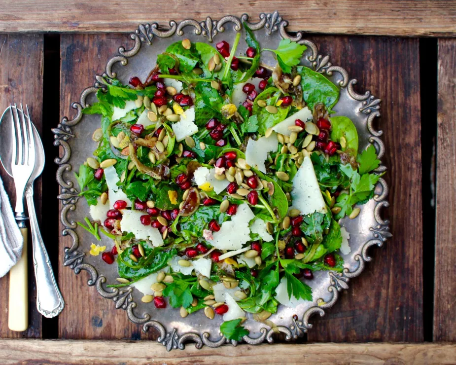 Massor av smak i en nyttig bufféesallad. Julbordet eller nyårsbufféen behöver inte vara helt vegetarisk eller vegansk för att vi ska kunna lägga till goda och inspirerande grönsaksrätter.