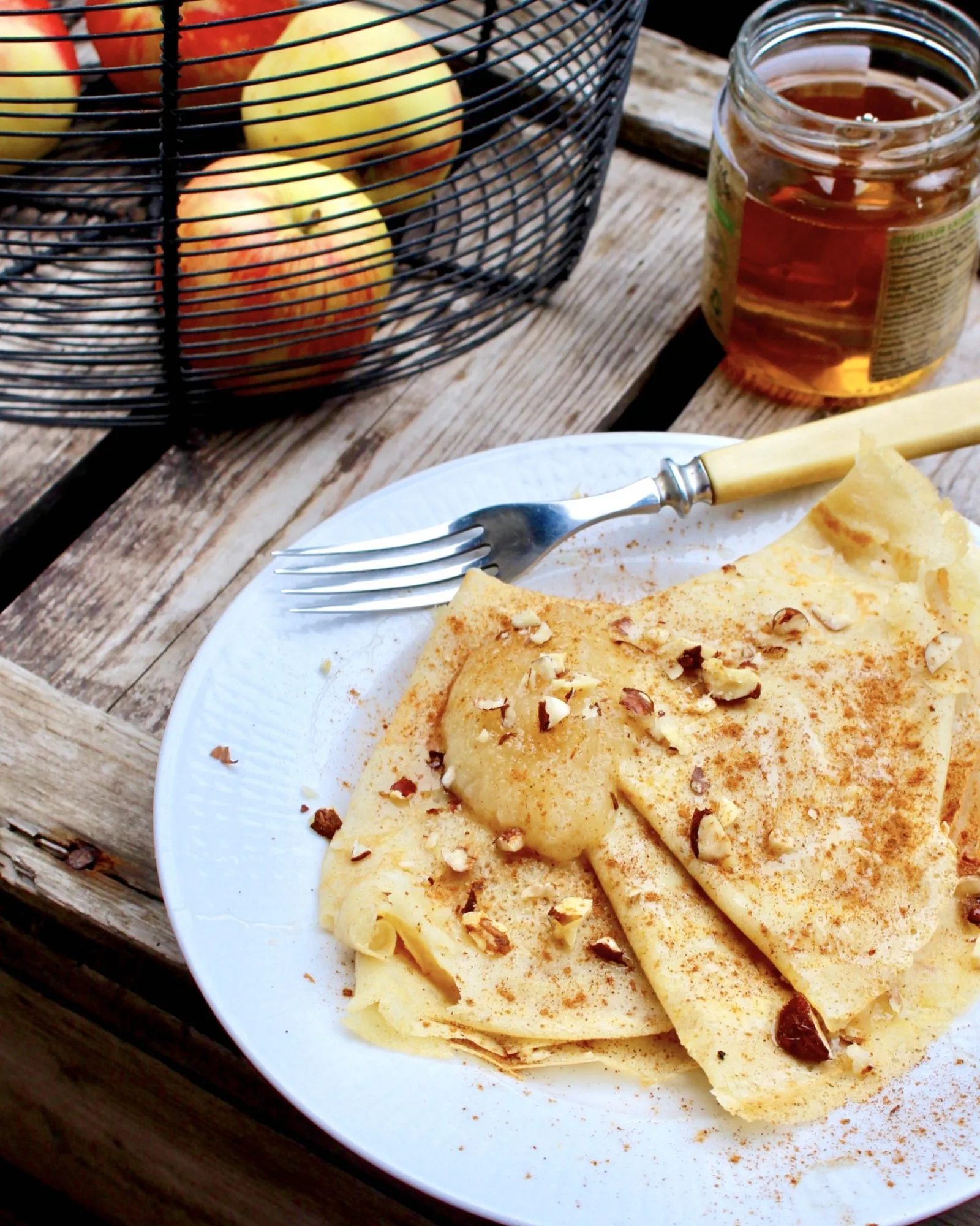 ayurveda brunch bröd dessert dryck efterrätt fermenterat fikabröd fisk fodmap frukost förrätter glass godis granola huvudrätt huvudrätter jul kaka kakor kostråd kyckling kött mellanmål paleo pannkakor pasta pizza produkttips sallad smoothie smårätter snacks soppa surdeg sås tilbehör tillbehör tårta vegan vegetariskt växtbaseratTunna glutenfria pannkakor med osötat äppelmos, honung och kanel