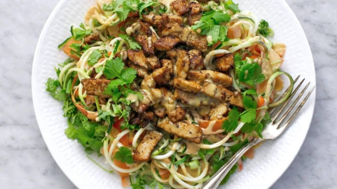Marinerad tofu med zoodles och jordnötssås Helt växtbaserad, proteinrik rätt med massor av smak och stor andel grönsaker. boka.nillaskitchen.com |