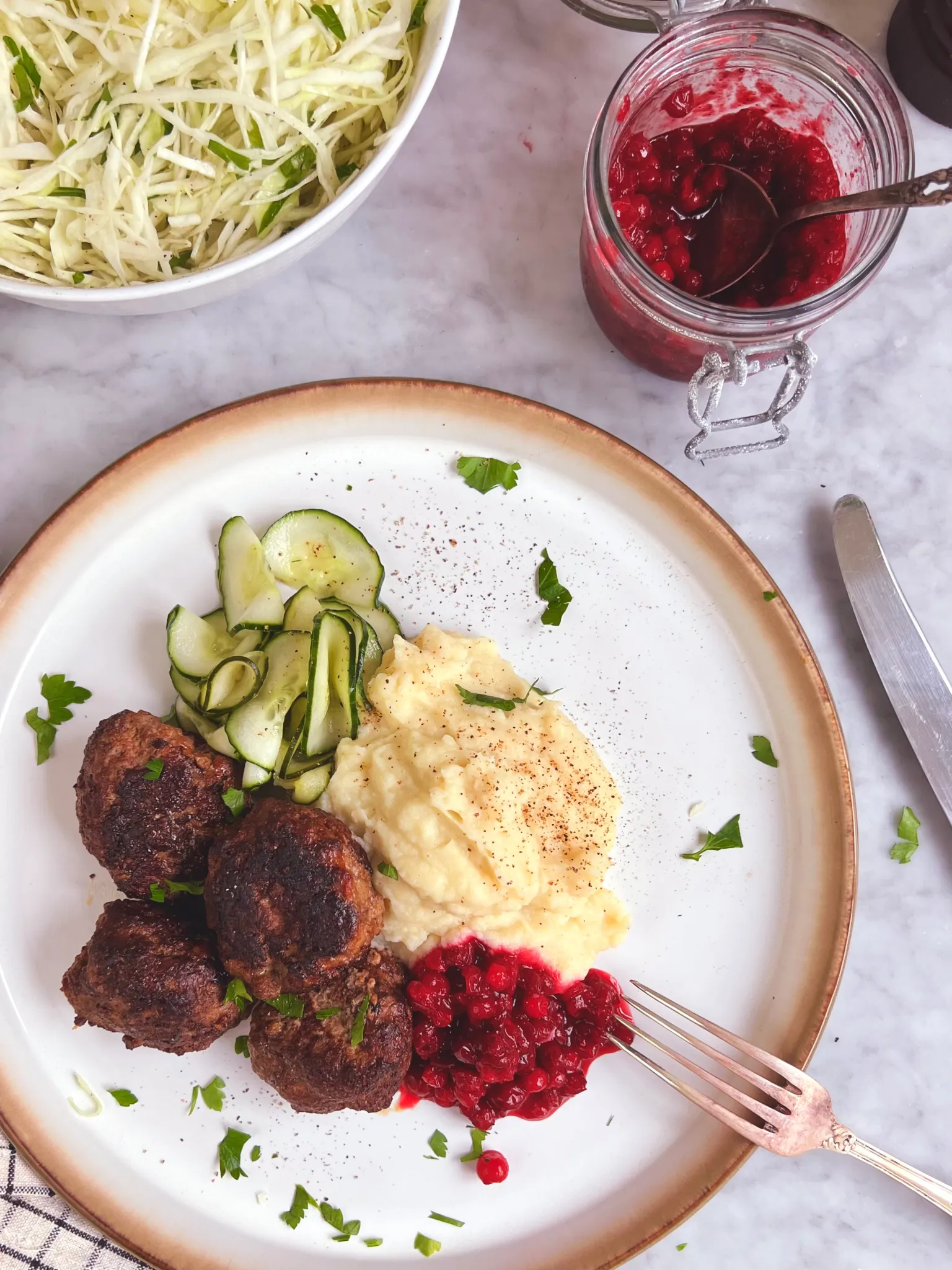 Otroligt god husmanskost men med naturliga och rena råvaror. Traditionell husmanskost tar klivet in i det naturliga köket kan man säga Jag har kombinerat vi hjort- och vildsvinsfärs i mina glutenfria vilt-köttbullar, som får sällskap av ett favorittillbehör: mos av rotselleri och blomkål.