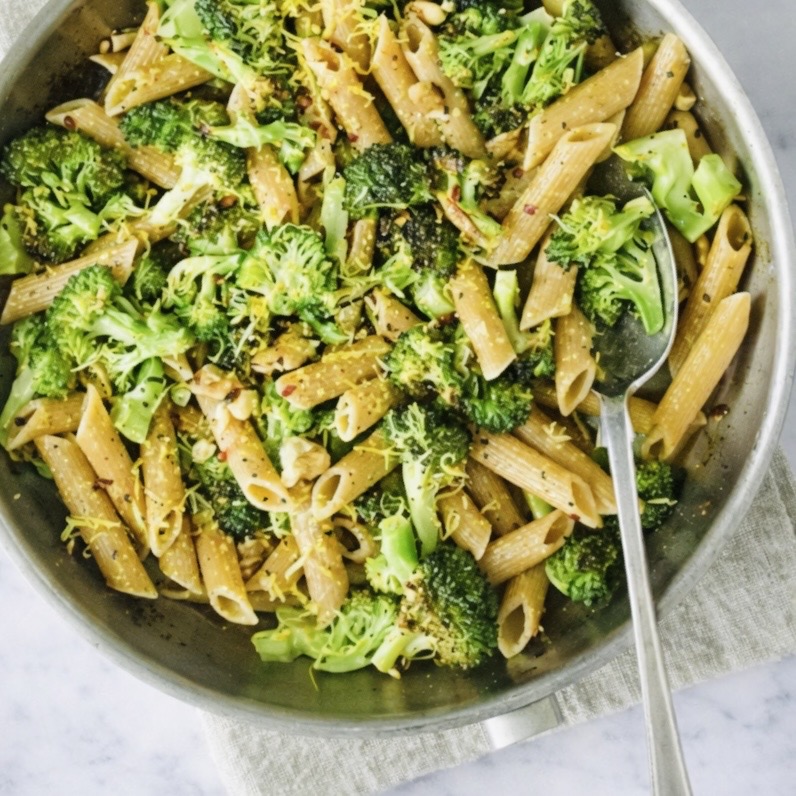 En enkel pastarätt med tydlig syra från citron, rostade toner från broccoli och valnötter och ett stadigt proteinbidrag från baljväxtbaserad pasta. Passar bra som lättare vardagsrätt och går snabbt att laga.