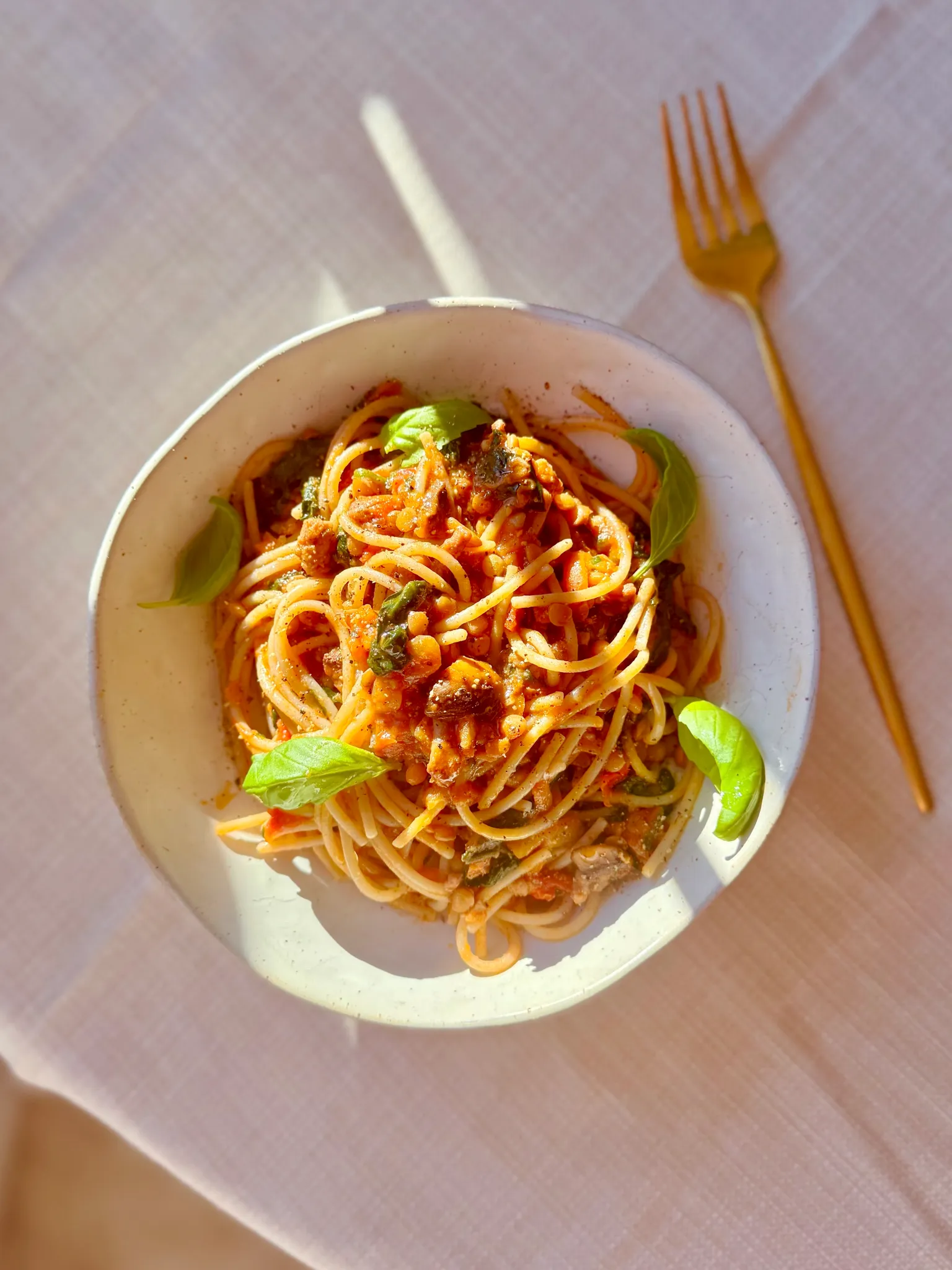 En djup, smakrik och växtbaserad tolkning av klassisk bolognese – full av umami, sötma och perfekt konsistens. Den här versionen är både näringstät och mättande, utan kött, men med allt som gör en bolognese själfull.