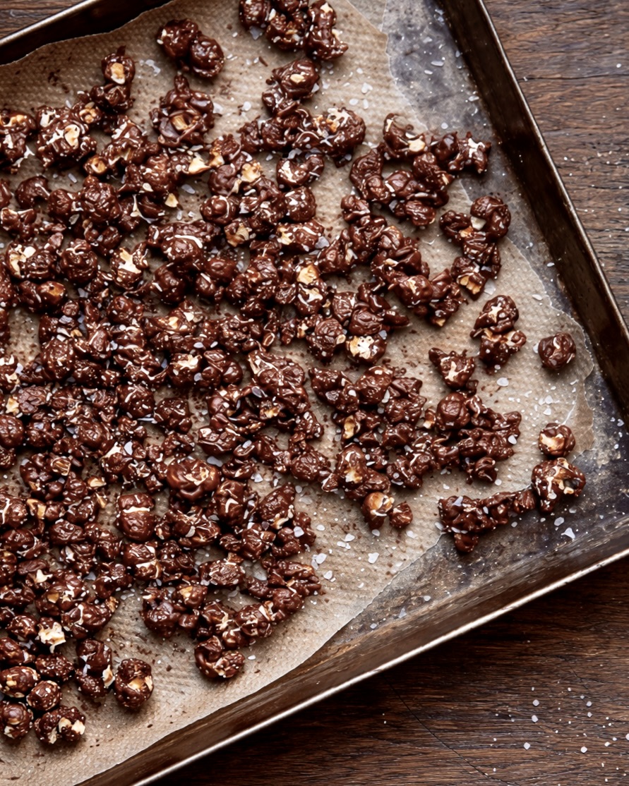 En enkel söt–salt snack på nypoppade popcorn vända i smält mörk choklad och toppade med flingsalt. Går snabbt att göra och passar som godis eller tilltugg.