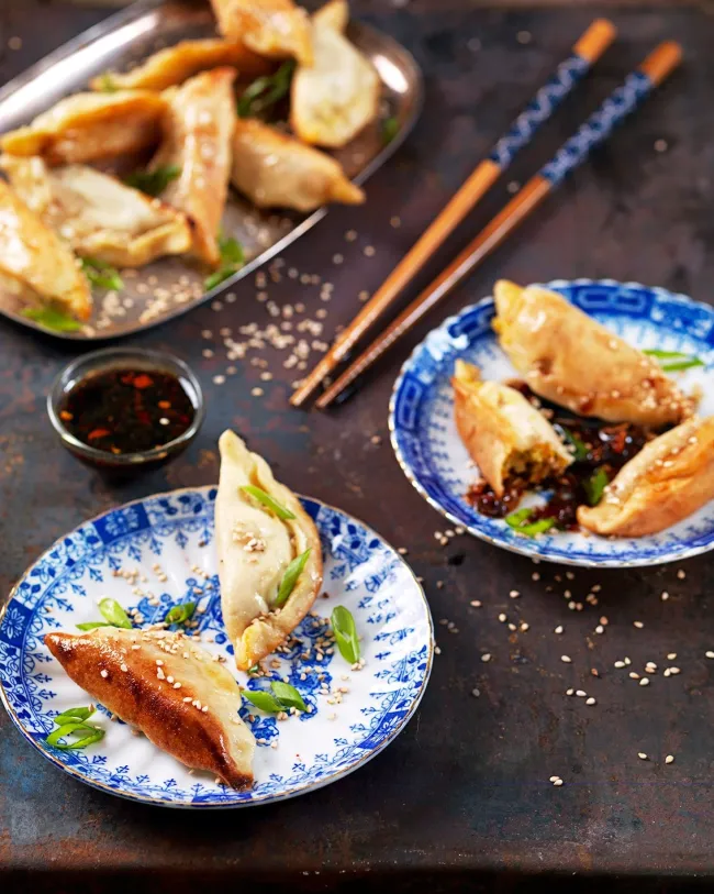 Dumplings kan förberedas i god tid och förvaras i kyl eller frys. De steks med vatten enligt klassisk metod tills undersidan är gyllene och botten krispig.
