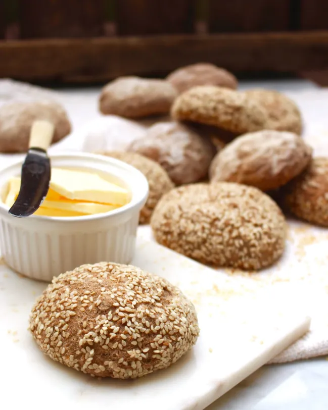 Underbart goda fullkornsfrallor med naturligt glutenfria ingredienser och utan extra stärkelse. Enkla att göra: rör bara ihop degen, låt vila kort, forma frallor och låt jäsa en gång direkt på plåten. Resultatet blir ett saftigt, mättande bröd med tydlig fullkornskaraktär och mild sesamsmak.