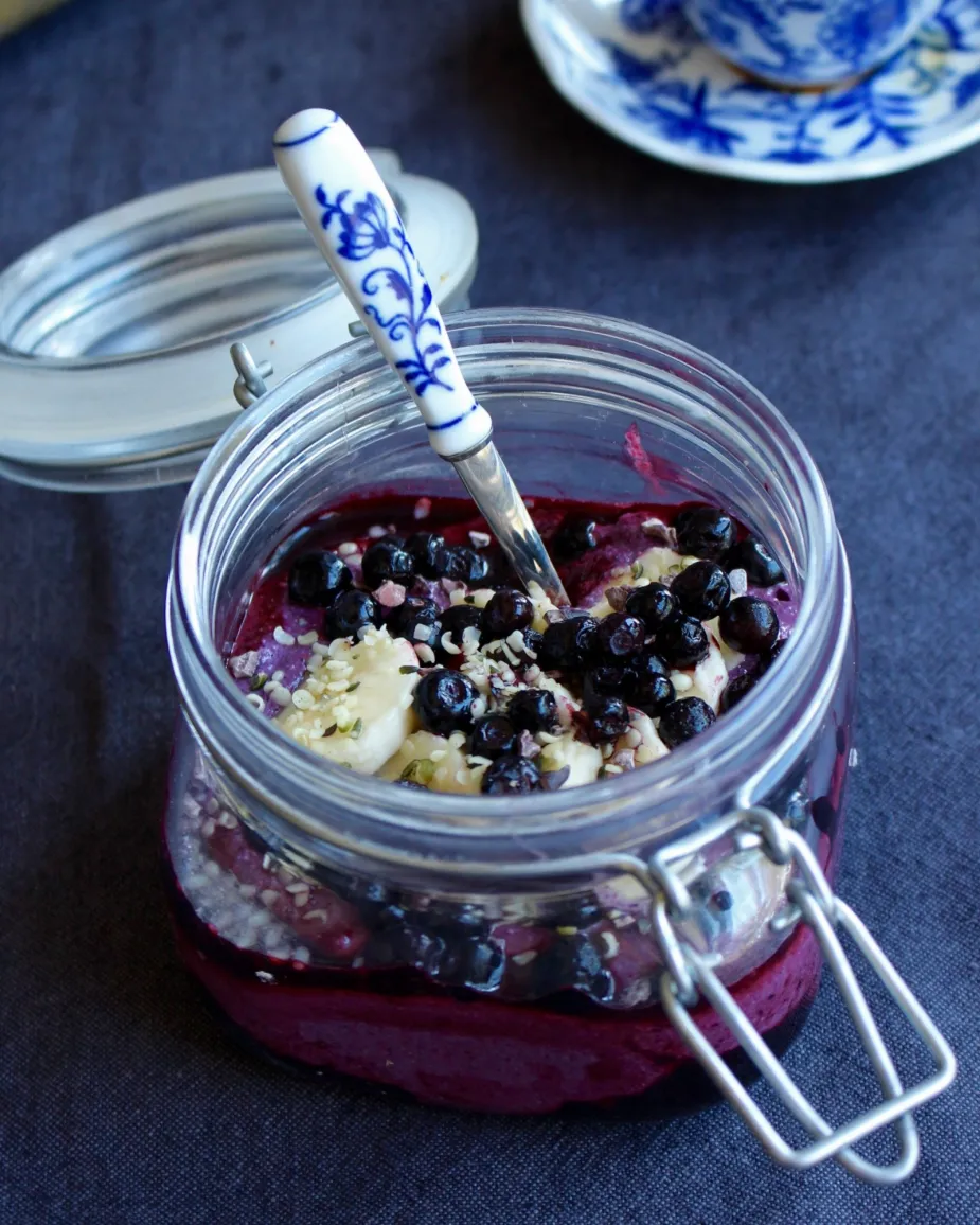 Raw bovetegröt med banan och blåbär.