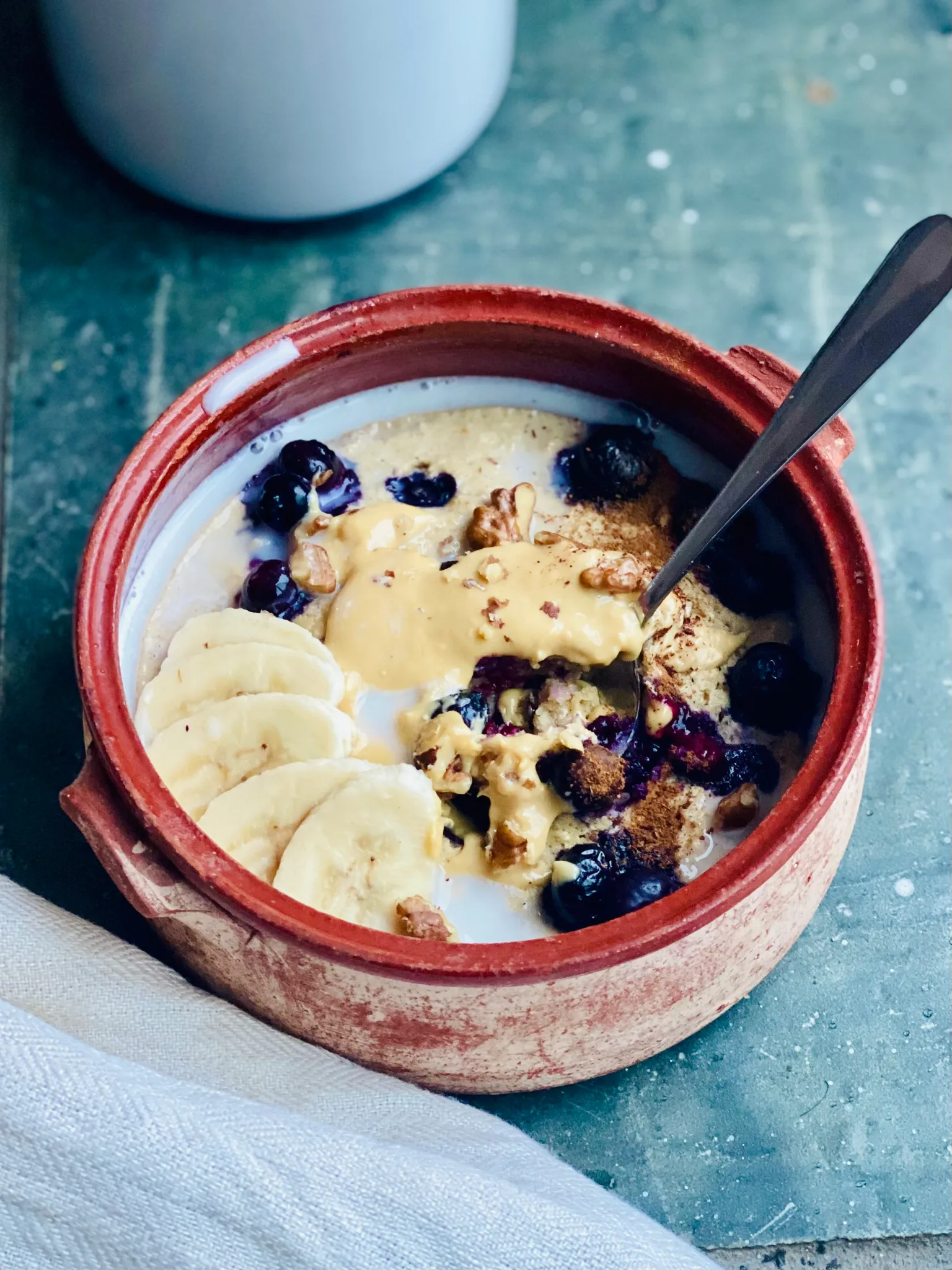 Bakad gröt med banan och blåbär.