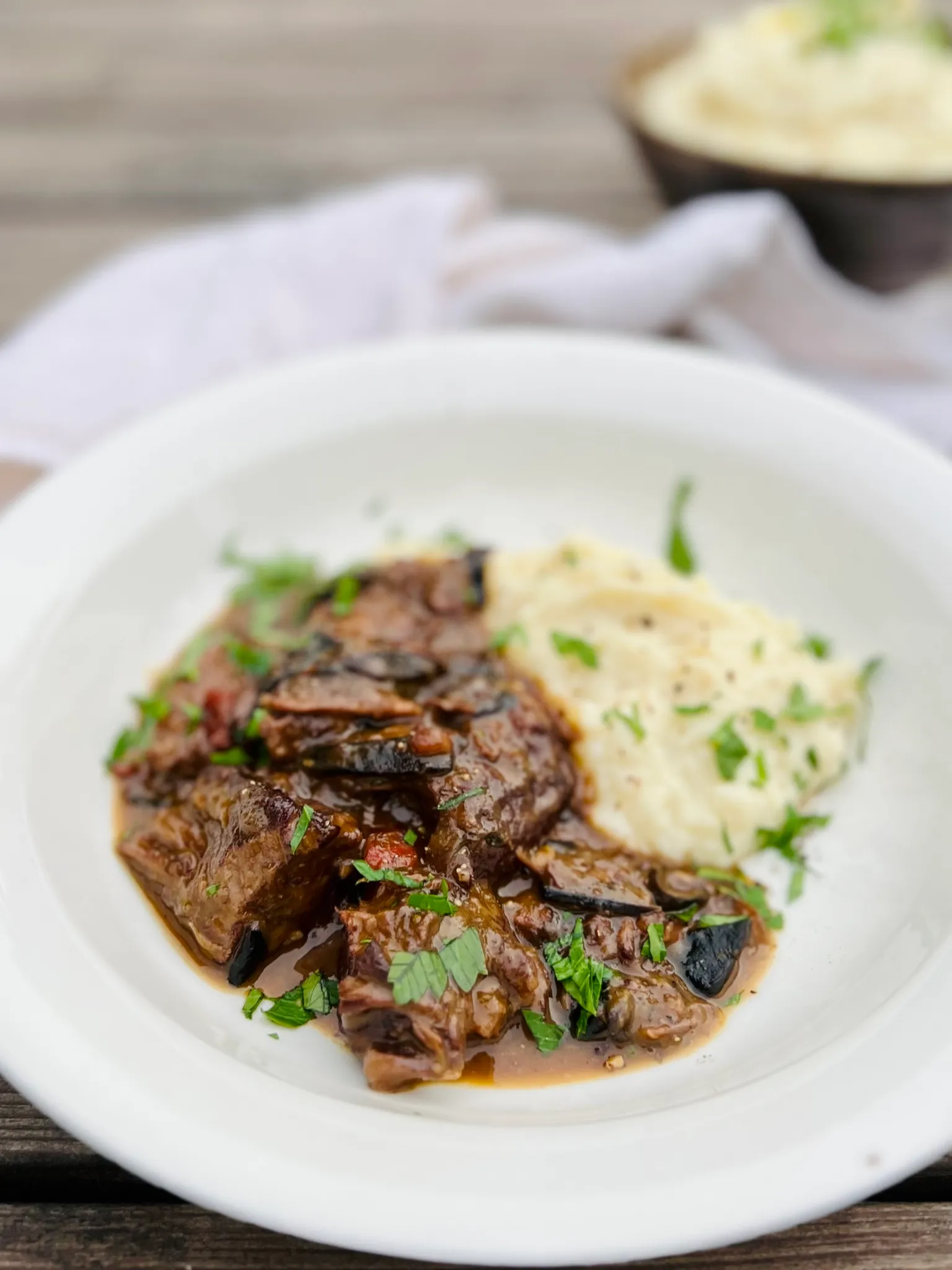Högrevsgryta med svamp och rotselleri- och blomkålspuré