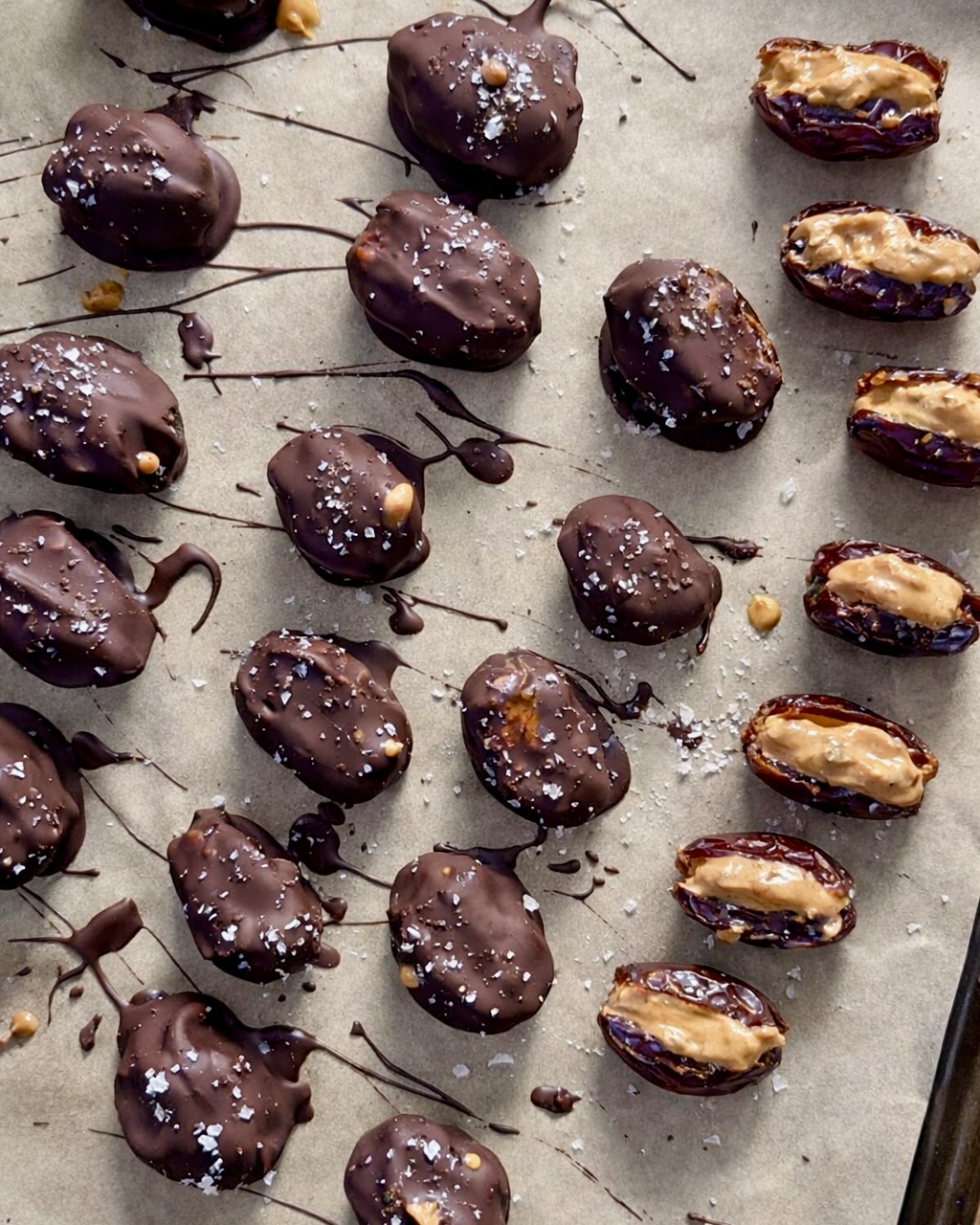 En enkel konfekt på dadlar fyllda med jordnötssmör och doppade i choklad. Kan ätas direkt eller förvaras kylt. Om dadlarna fryses en kort stund innan de doppas i choklad stelnar chokladen snabbare, men det är valfritt. Inte den snyggaste ytan på chokladen men fortfarande gott så...
