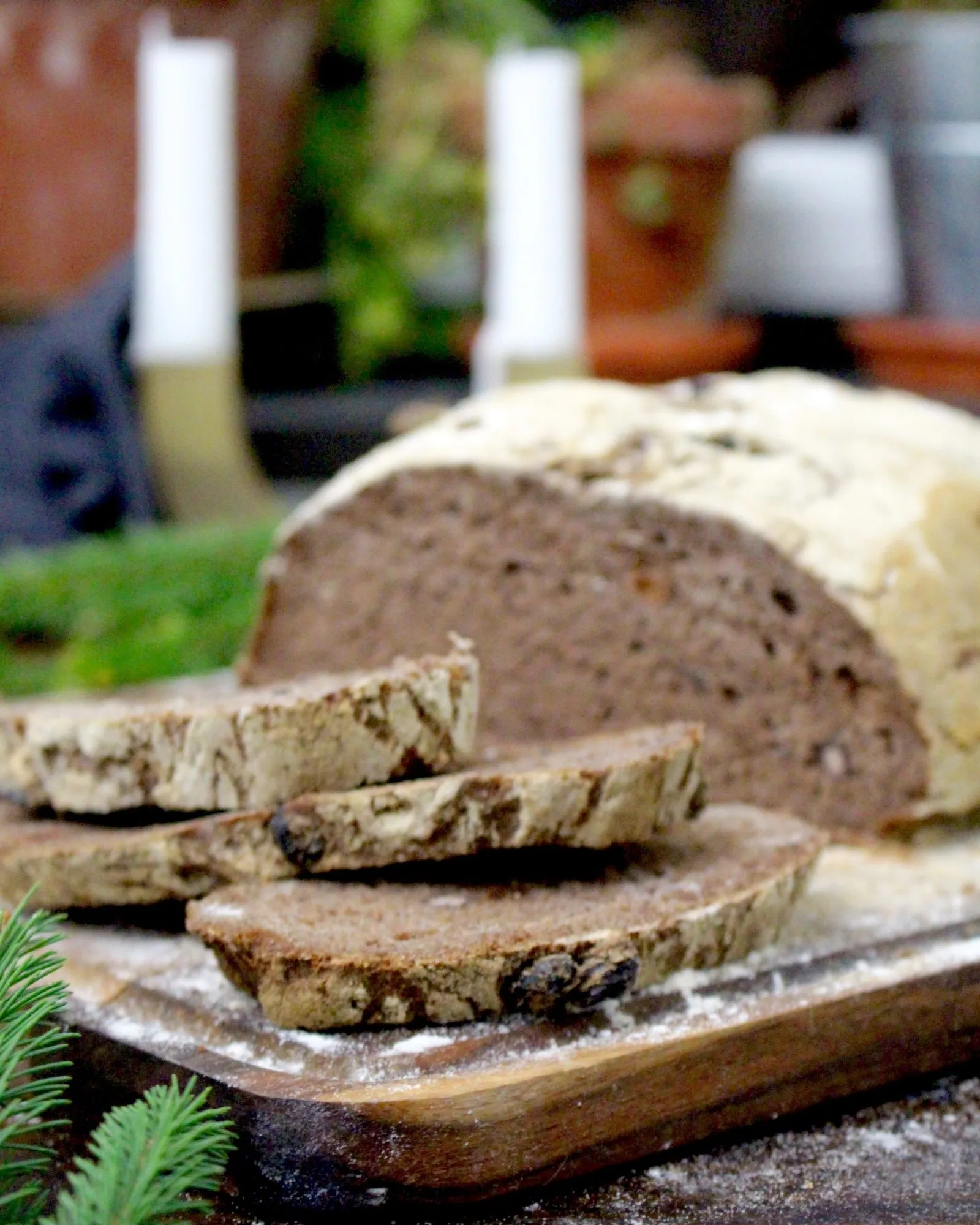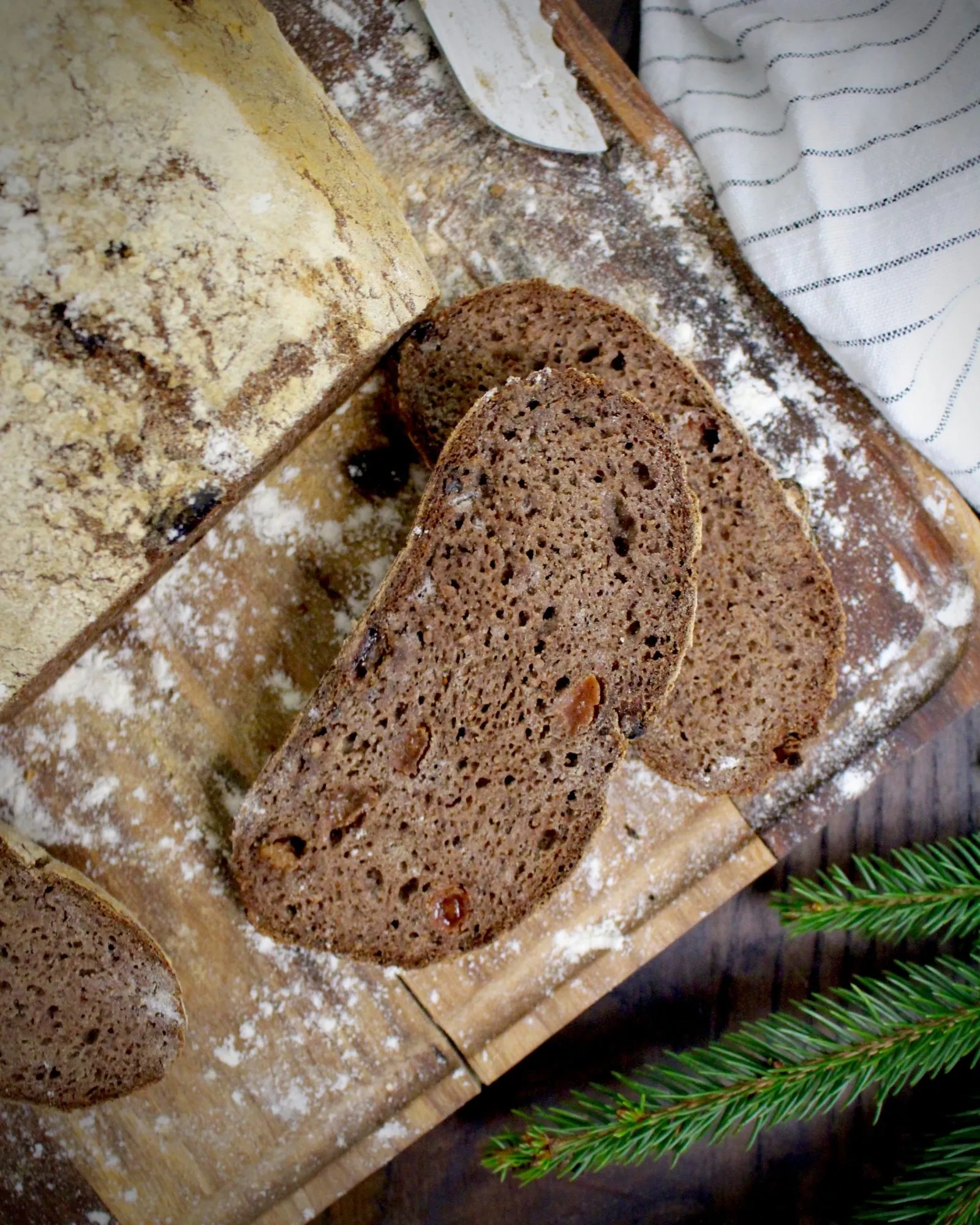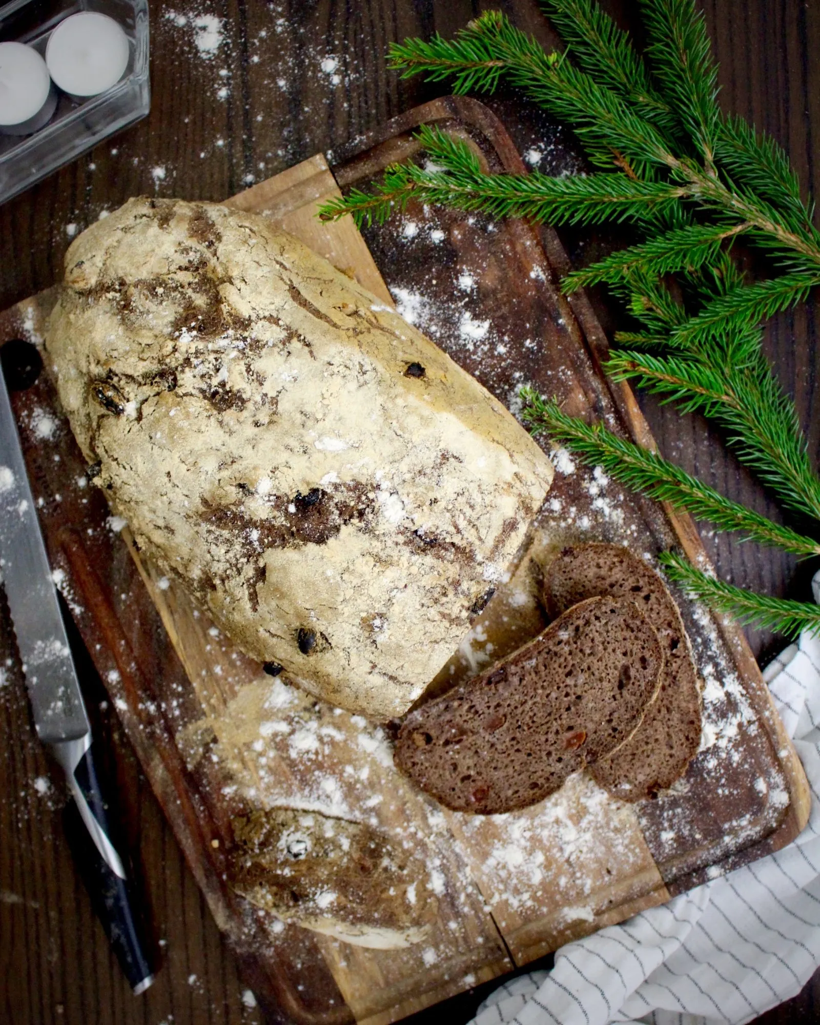 Till slut blev jag verkligen nöjd med det här smakrika julbrödet. Det krävdes några provomgångar för att få till konsistensen. Jag ville ha ett saftigt bröd som samtidigt skulle gå att fri-jäsa på plåt, utan form.