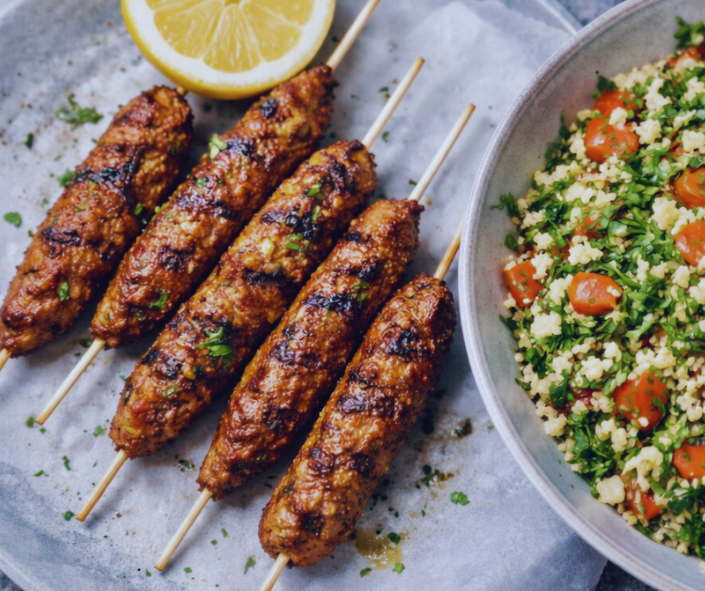 Kryddiga, saftiga spett med lamm och nöt-färs, serverade med en fräsch tabbouleh på quinoa, persilja, tomat och citron. En enkel rätt att göra med tydlig mellanösternkänsla, funkar lika bra på grillen som i stekpannan.