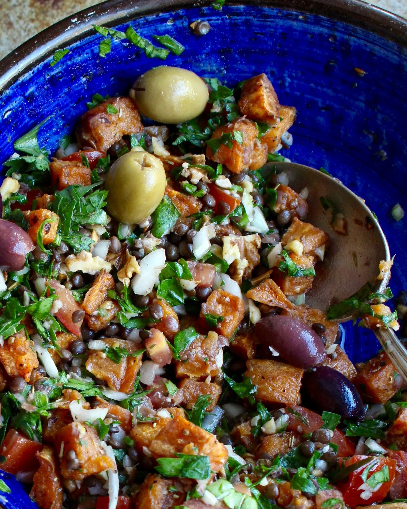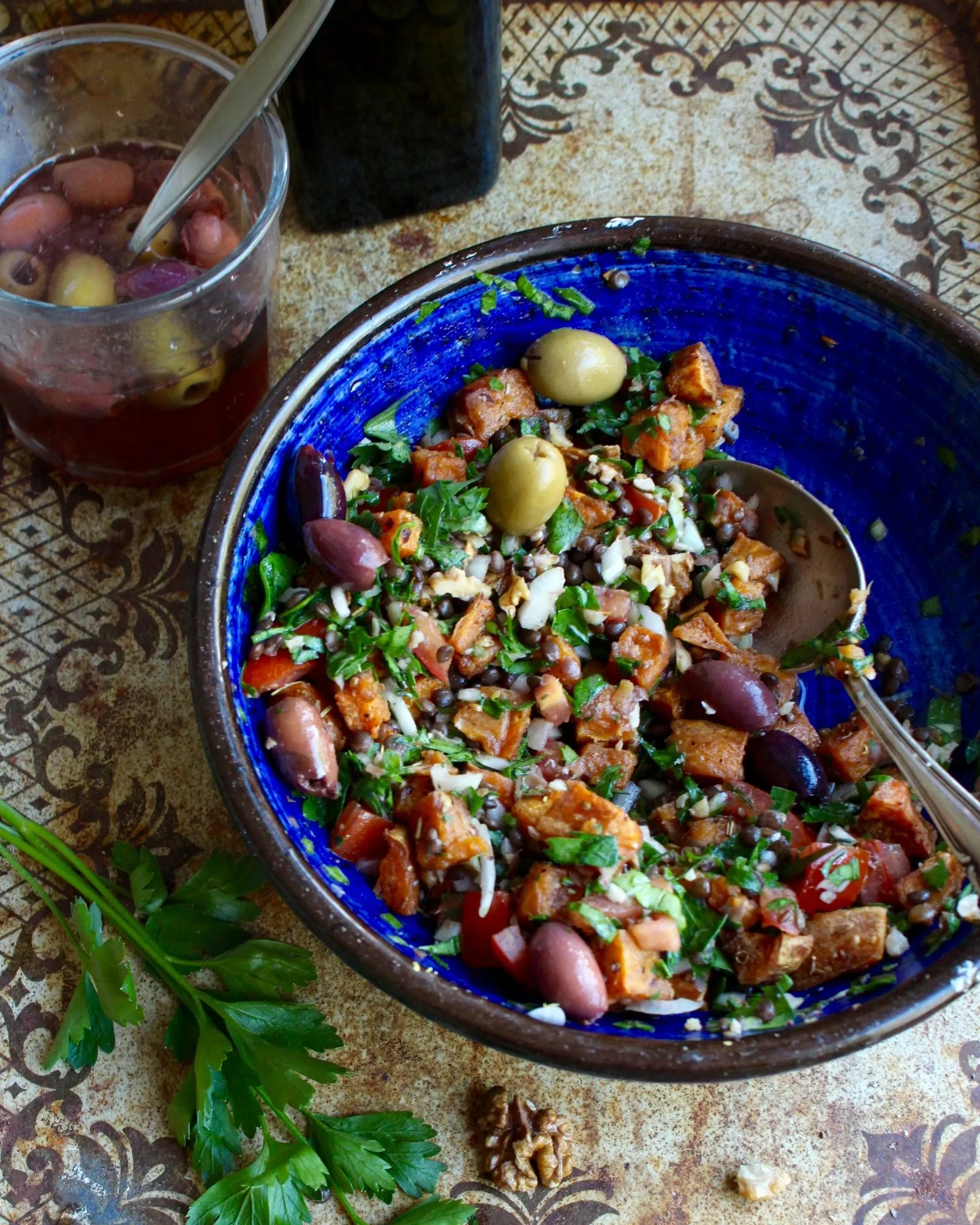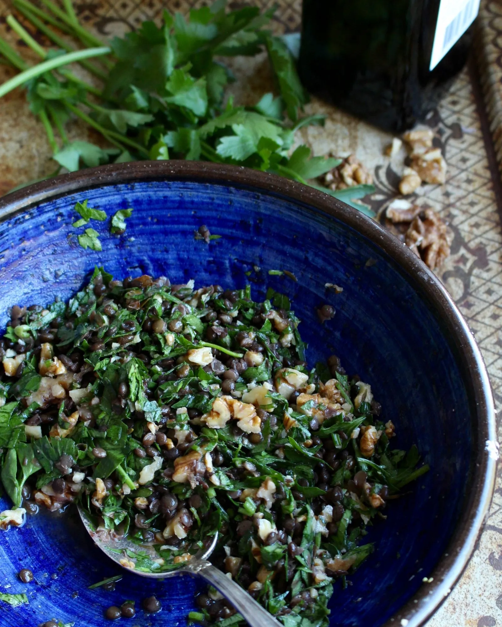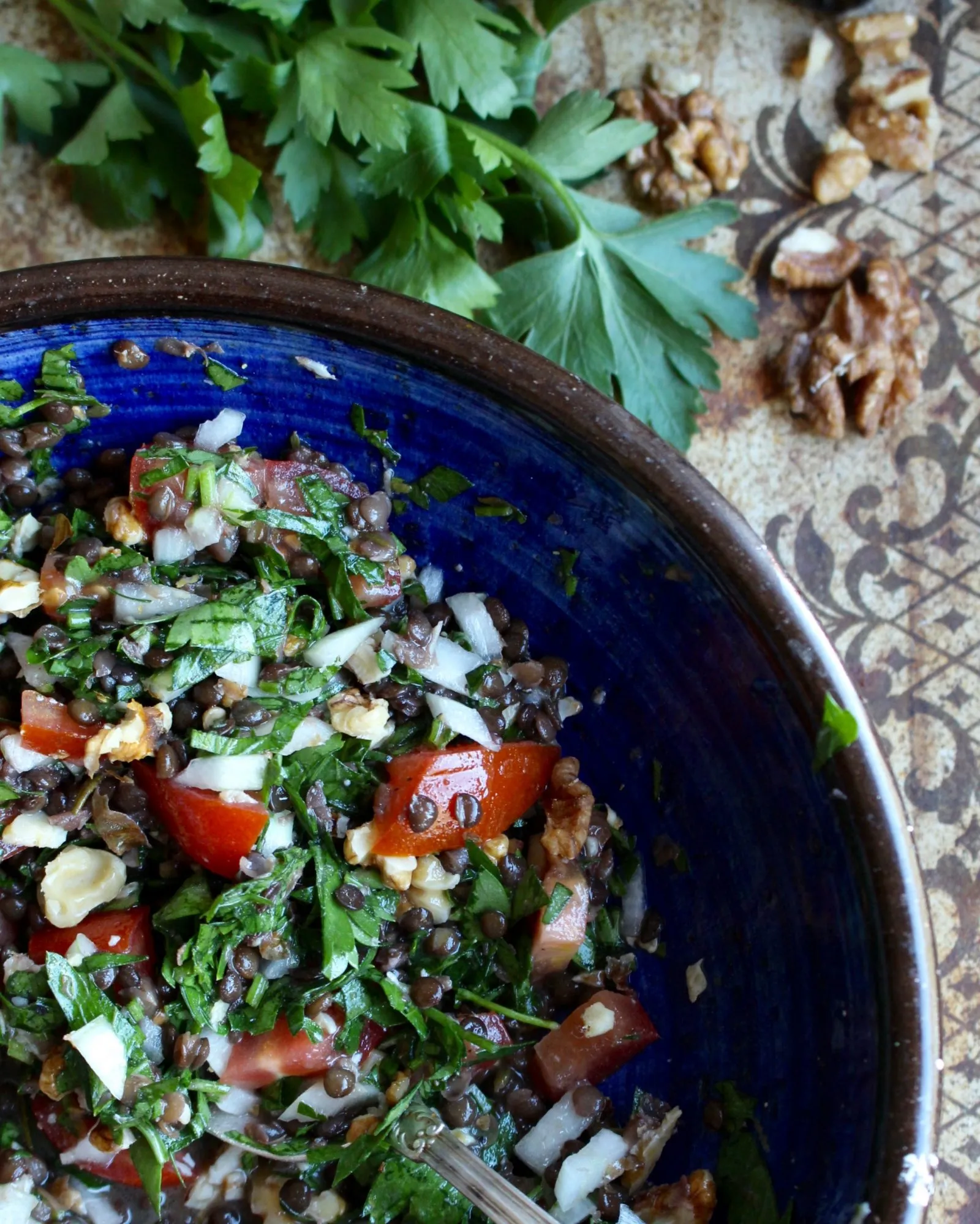 Salladen går att variera i sammansättning och mängd. Basen med persilja, valnötter, linser och dressing fungerar utmärkt som tillbehör eller på buffé. Tomat och lök ger ytterligare djup och fyllighet.