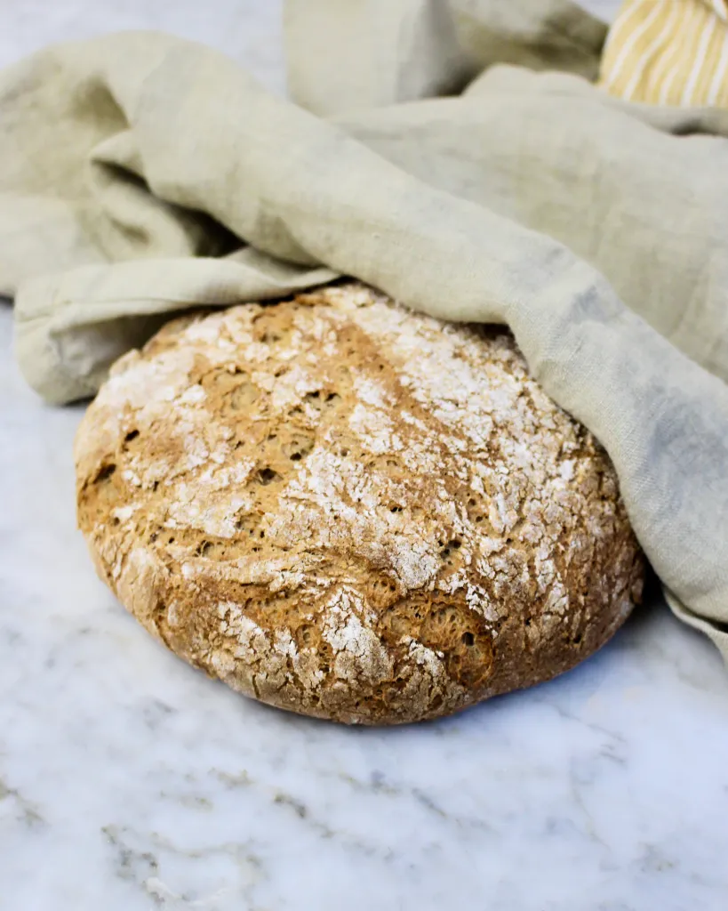 Jag har alltså bakat brödet i ugn nu. Det blir ett litet runt, saftigt bröd med krispig skorpa. Vill du ha en större sats bröd, dubbla receptet.