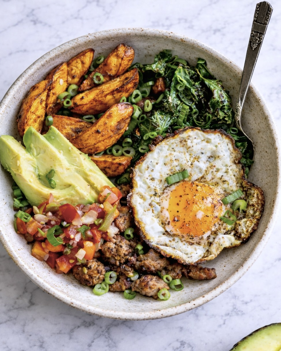 Den här frukostskålen har blivit en favorit! Receptet är enkelt att laga om du förbereder för några dagar i förväg (rosta sötpotatisen och steka köttet) : då är det bara att värma på på morgonen...