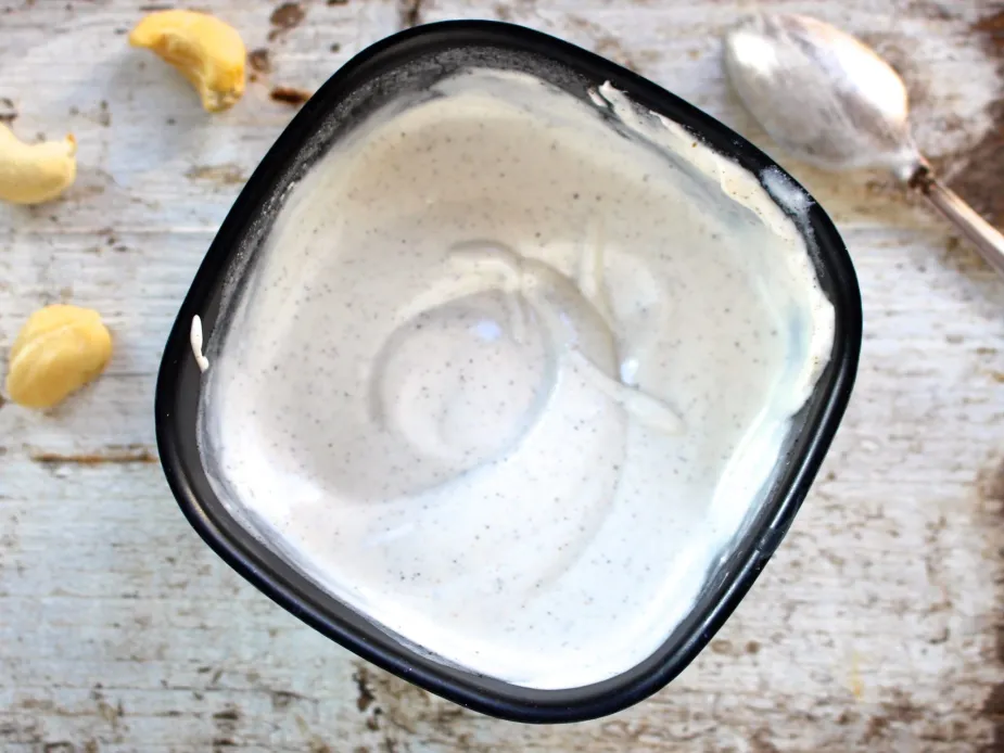 OBS! För att vaniljsåsen ska bli helt slät behöver cashewnötterna ligga i blöt enligt receptet och din blender eller mixer vara tillräckligt stark, minst 700 W enligt min erfarenhet. Med en stark motor blir konsistensen len och slät på 1–2 minuter.