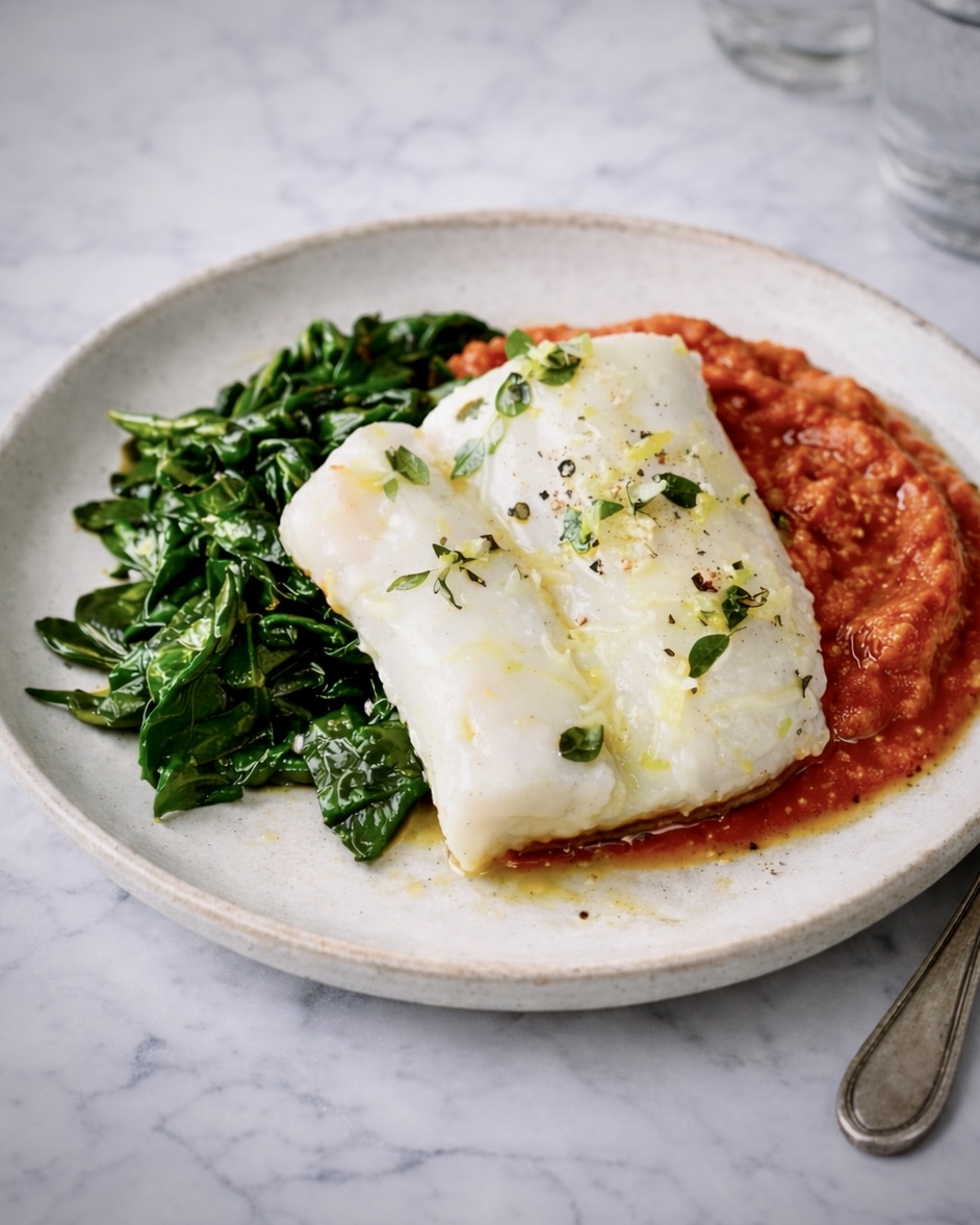 Ört- och vitlöksbakad vit fisk med romescosås och spenat