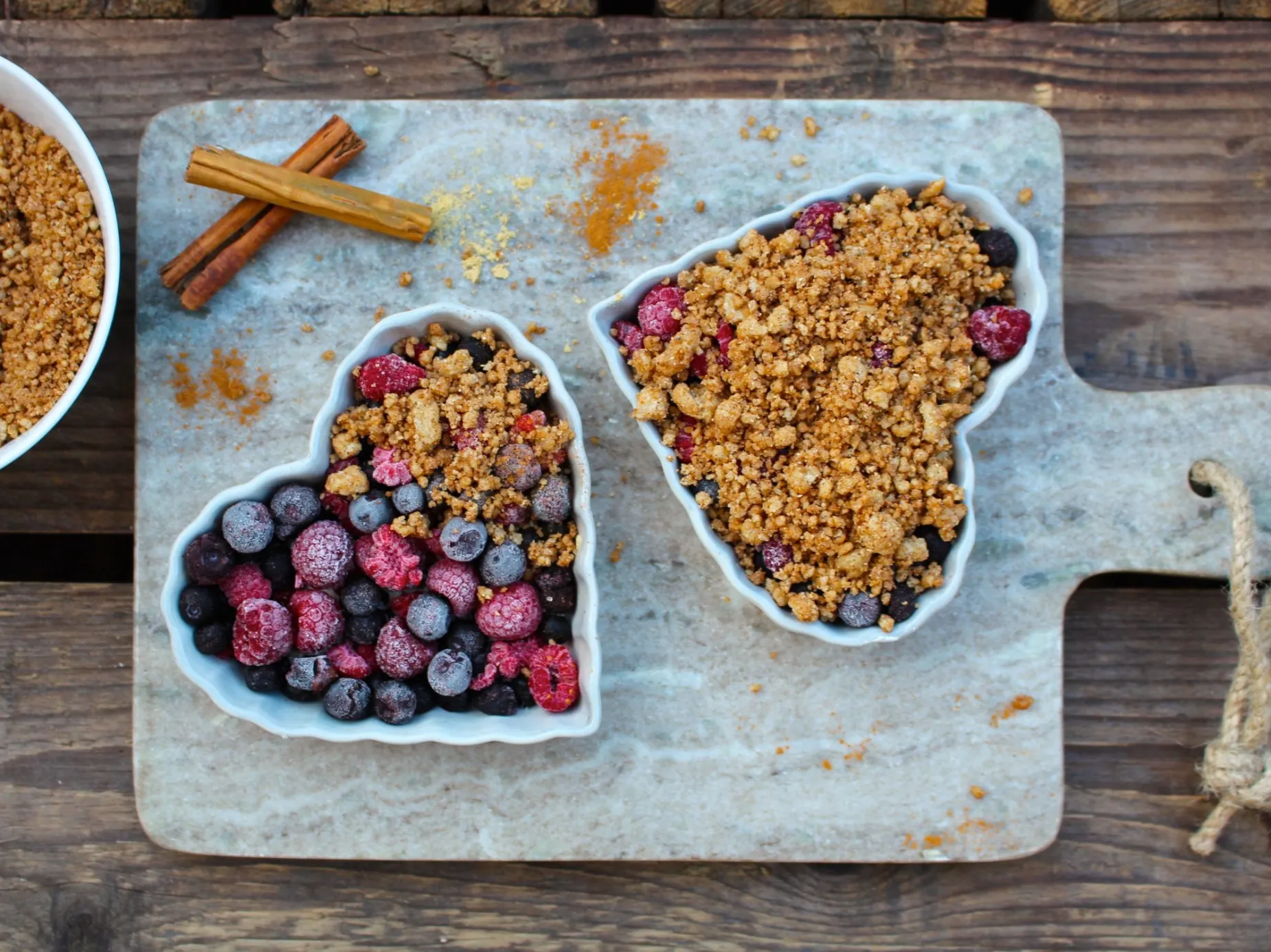 Ett annat tips är att i stället för kryddor använda smulade glutenfria pepparkakor. Pepparkakssmulet ersätter då en del av mjölet och sockret. Använd till exempel fyra stora glutenfria pepparkakor som smulas i en bunke. Tillsätt kokosolja och bara lite mjöl och extra socker. Blanda ihop och tillsätt så mycket mjöl som behövs för att få en bra konsistens. Smaka av så att degen är söt och god. Tänk på att bären är syrliga och behöver lite extra sötma från degen.