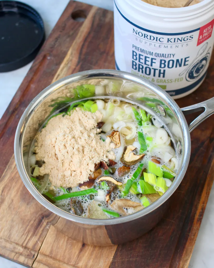 Du kan använda egen färdig benbuljong som du sedan låter sjuda med kryddor och smaksättning eller så använder du äkta benbuljongpulver (som jag gjort) med samma läkande egenskaper. Jag har inte möjlighet att ha en massa benbuljong i frysen (har en lite frys) så benbuljongpulver är perfekt för mig. Jag använder det flera gånger per vecka i olika soppor, såser, grytor osv.