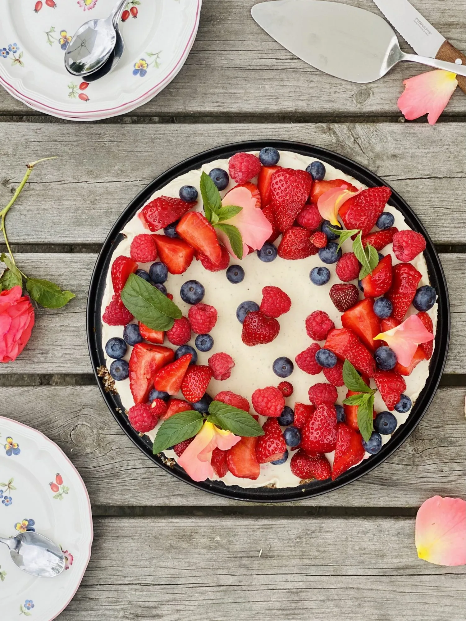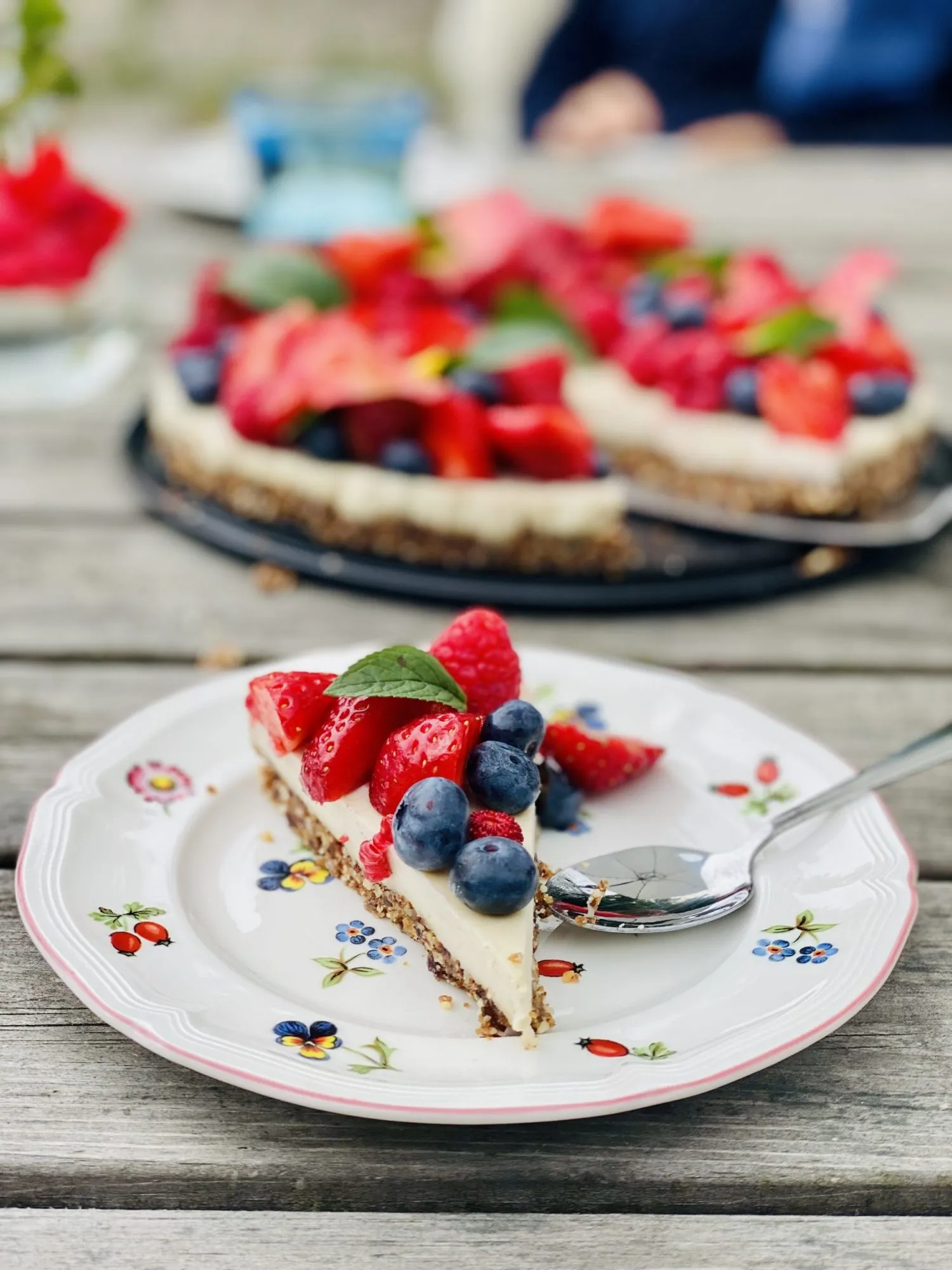 Denna gräddtårta i raw-food-format är en riktig sommarfavorit. Med en mandelbotten smaksatt med kardemumma, en len och krämig vanilj- och citronfyllning samt massor av färska bär på toppen blir varje bit en fest för både öga och gom.
