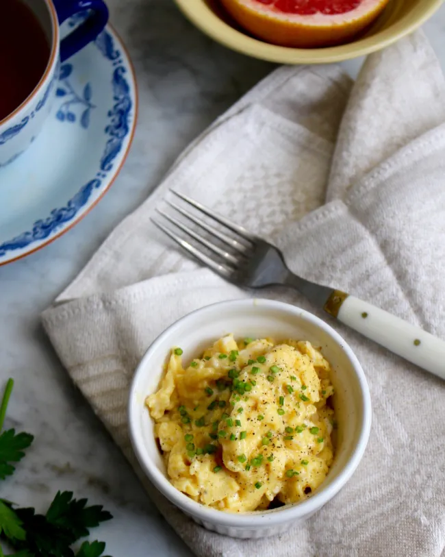 Ibland är det enkelt. Två perfekt krämiga scrambled eggs till frukost och lite grönsaker. Det mår min mage bra av och ger mig pigg, klar energi för dagen.