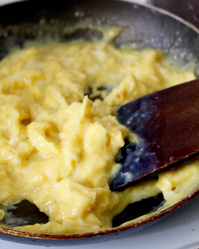 Äggen blir perfekta genom att stekas långsamt under omrörning, helst i smör men ghee eller olivolja fungerar också. Temperaturen ska vara låg och jämn. Ta pannan från värmen när äggen fortfarande är krämiga. Smaksätt enkelt med salt, peppar och lite gräslök.