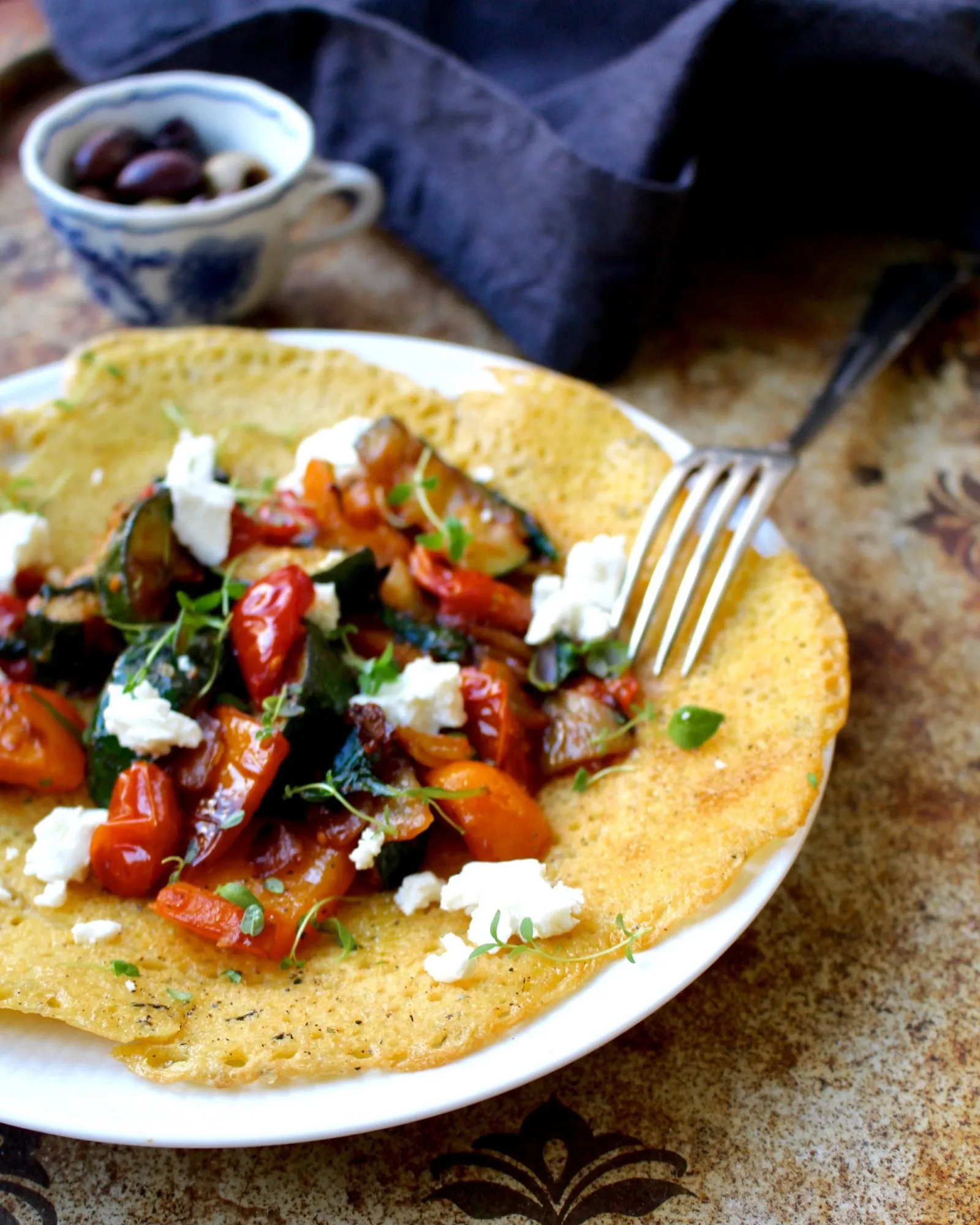 Socca i Frankrike och farinata i Italien är matiga pannkakor gjorda på kikärtsmjöl, fria från gluten, ägg och mjölk. Det gör dem också veganska. Jag har valt att ibland smula lite getost över, men den kan uteslutas helt eller ersättas med hackade valnötter eller rostade solrosfrön.