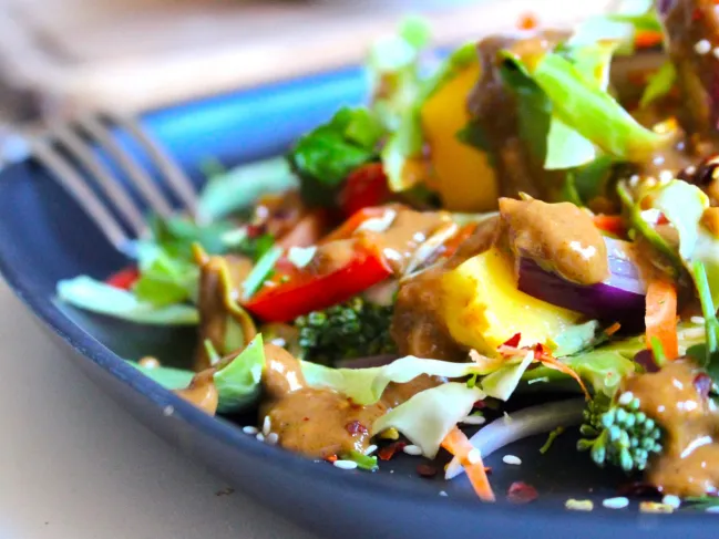 En färgglad och smakrik sallad man blir glad av! Såklart späckad av nyttigheter och med inflammationsdämpande kryddning : färsk ingefära, vitlök och chili. Man behöver inte leva enligt raw-food eller ens vara vegetarian för att äta rawfood-mat några gånger i veckan. Välj det för att det är gott!