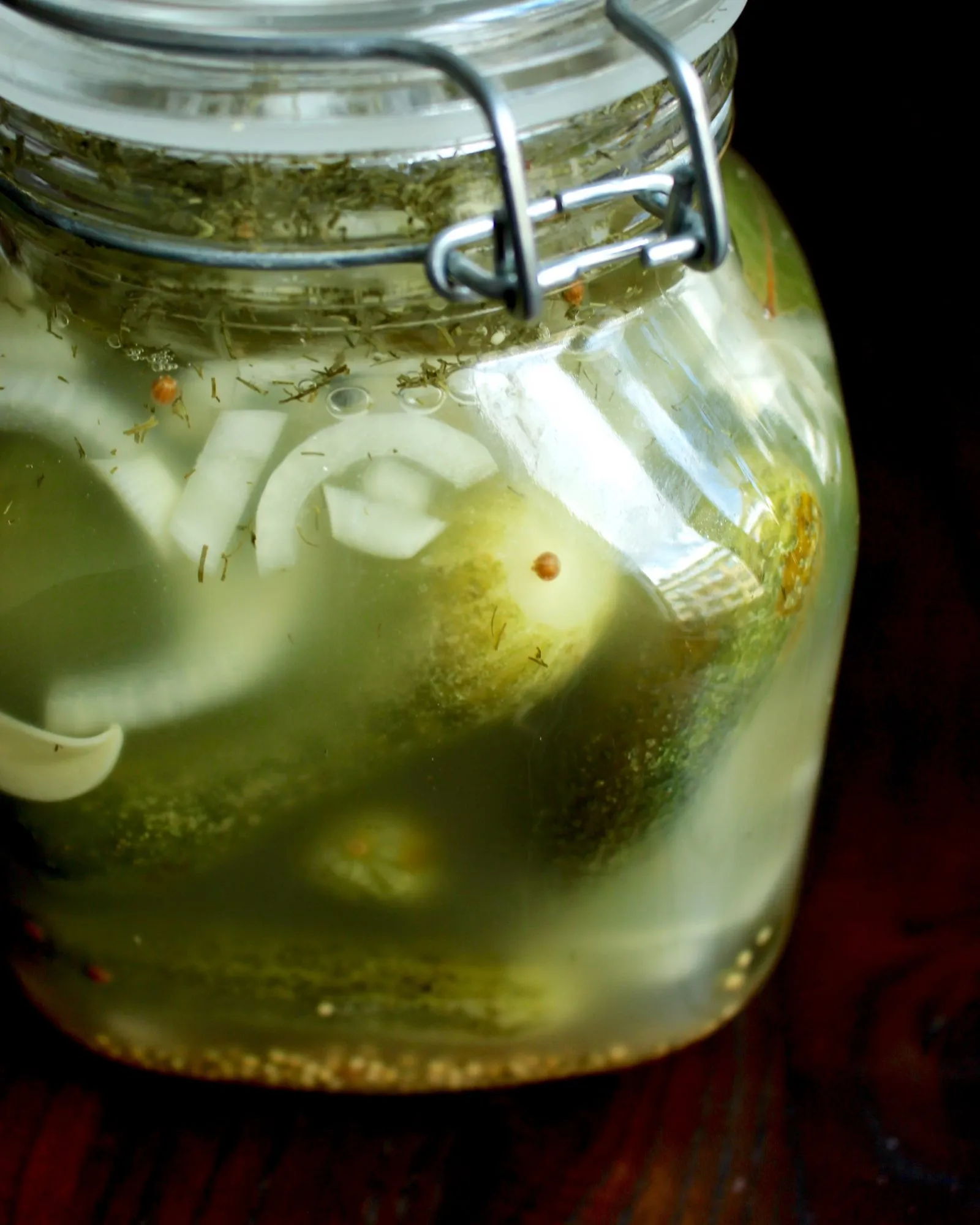 Jag smaksätter gurkorna klassiskt med senapsfrön, lök, vitlök och dill. Pepparrot och vinbärsblad är också vanliga smaksättningar. Under de första dagarna bubblar det ofta rejält och spadet kan bli lätt grumligt – det är normalt och ett tecken på att jäsningen är igång.